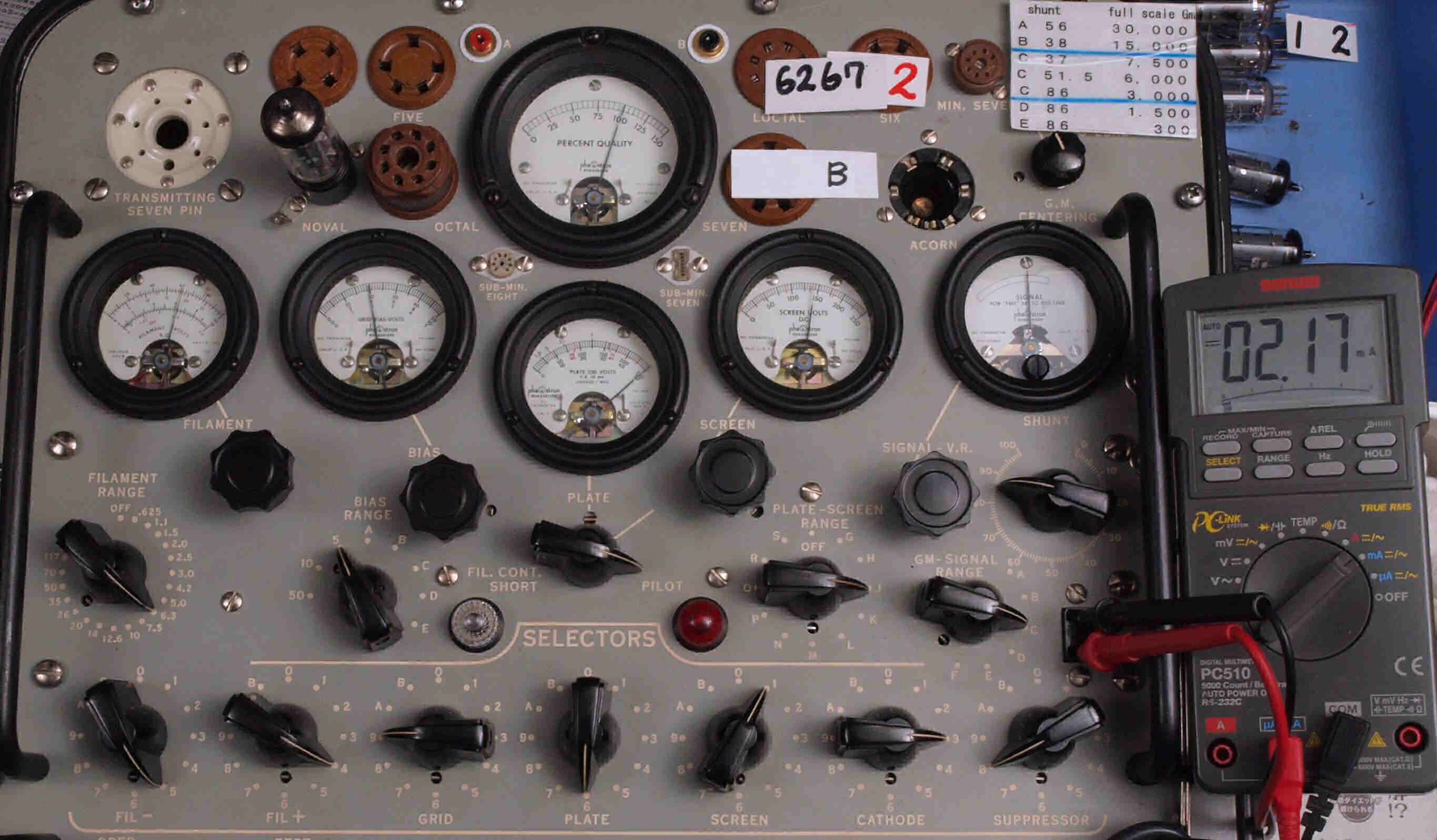| U12. 付属2本目「6267」。 Gm測定=2000μmho、IP=2.17mA。 Cレンジ=3000μmhoレンジでの測定、「Ep=250V、Esg=150V、Eg1=−2V」 |