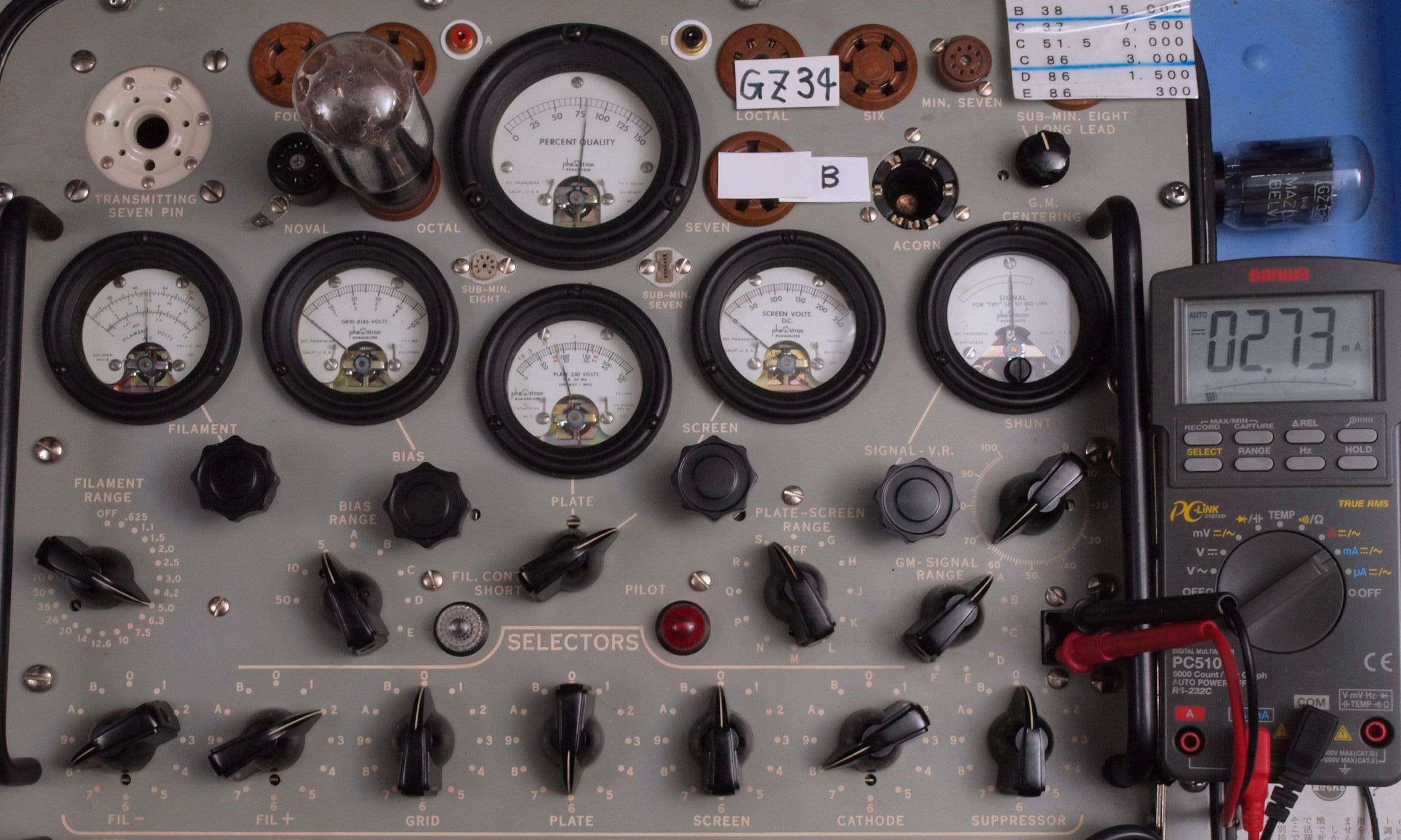 | U31. 付属「GZ34(5AR4)」ユニット1 エミション測定=80、Ip=2.73mA。 Vacuum Tube Tester Hickok TV-2B/U の「5U4」検査方法による、破棄値=75。 |