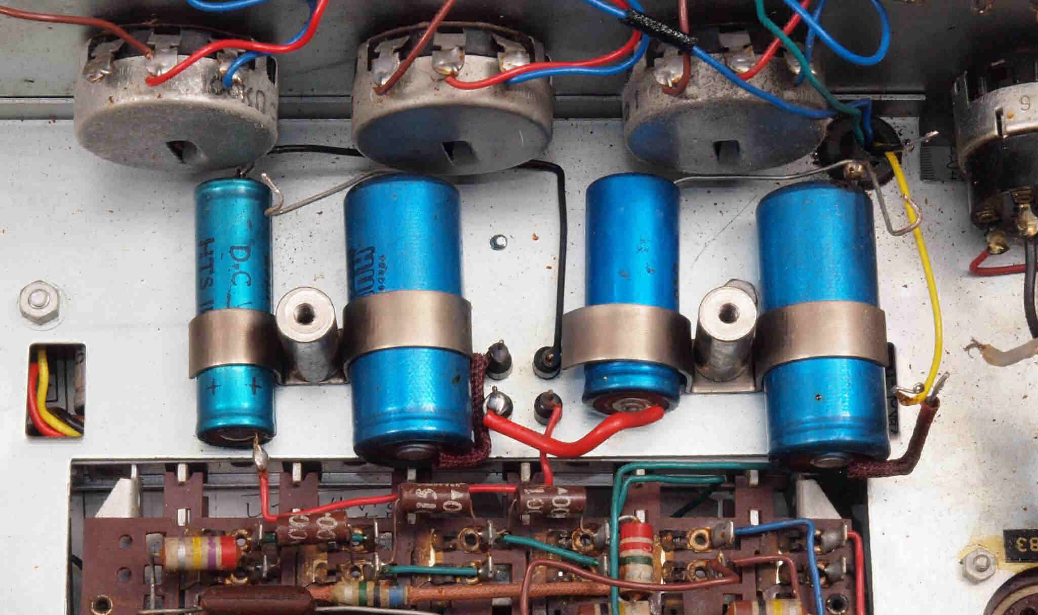 | C15. 修理後 ケースから出し、上から見る。 電解コンデンサー3個、フイルムコンデンサー2個交換。 | ||||||||||||||||||||||||||