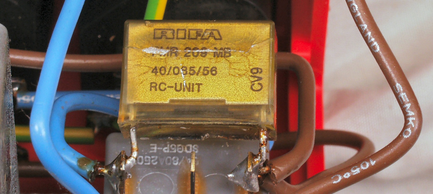 A5. 点検中 ヒビが入った雑音防止コンデンサー。