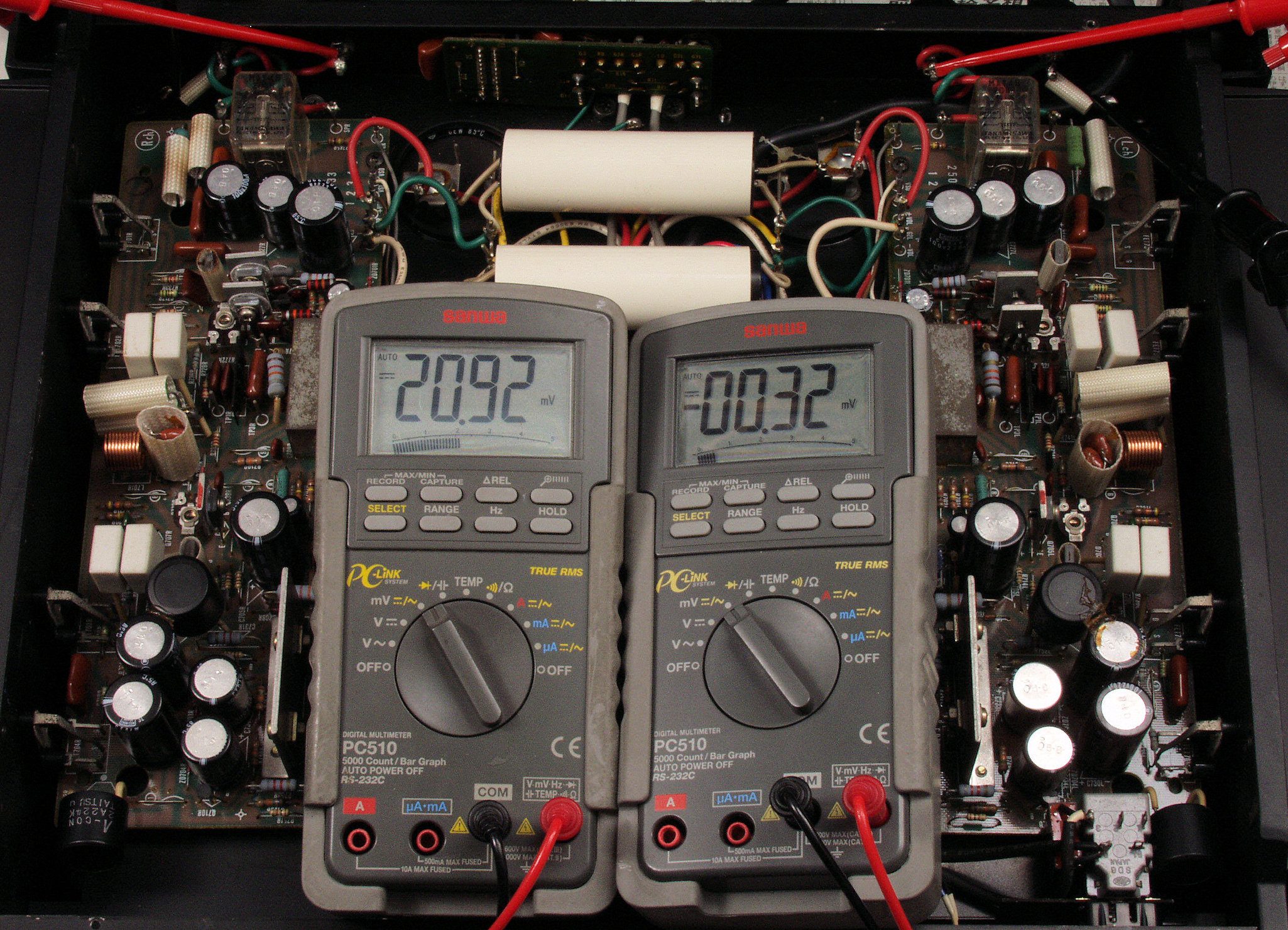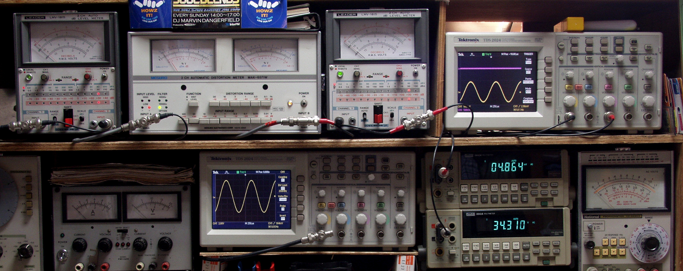 上段中左 歪み率計=出力の歪み率測定 左メータ=L出力、右メータ=R出力。
