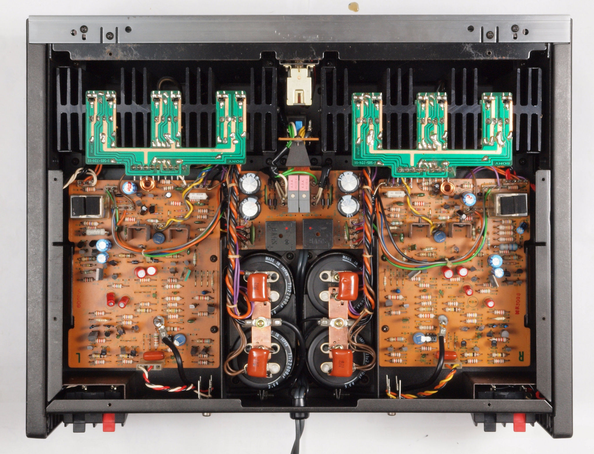 | C92. 修理後 電源ブロック電解コンデンサー下。 フイルムコンデンサー4個追加。終段V−FET(縦型電解効果トランジスター)保護ヒューズ4本挿入。 |