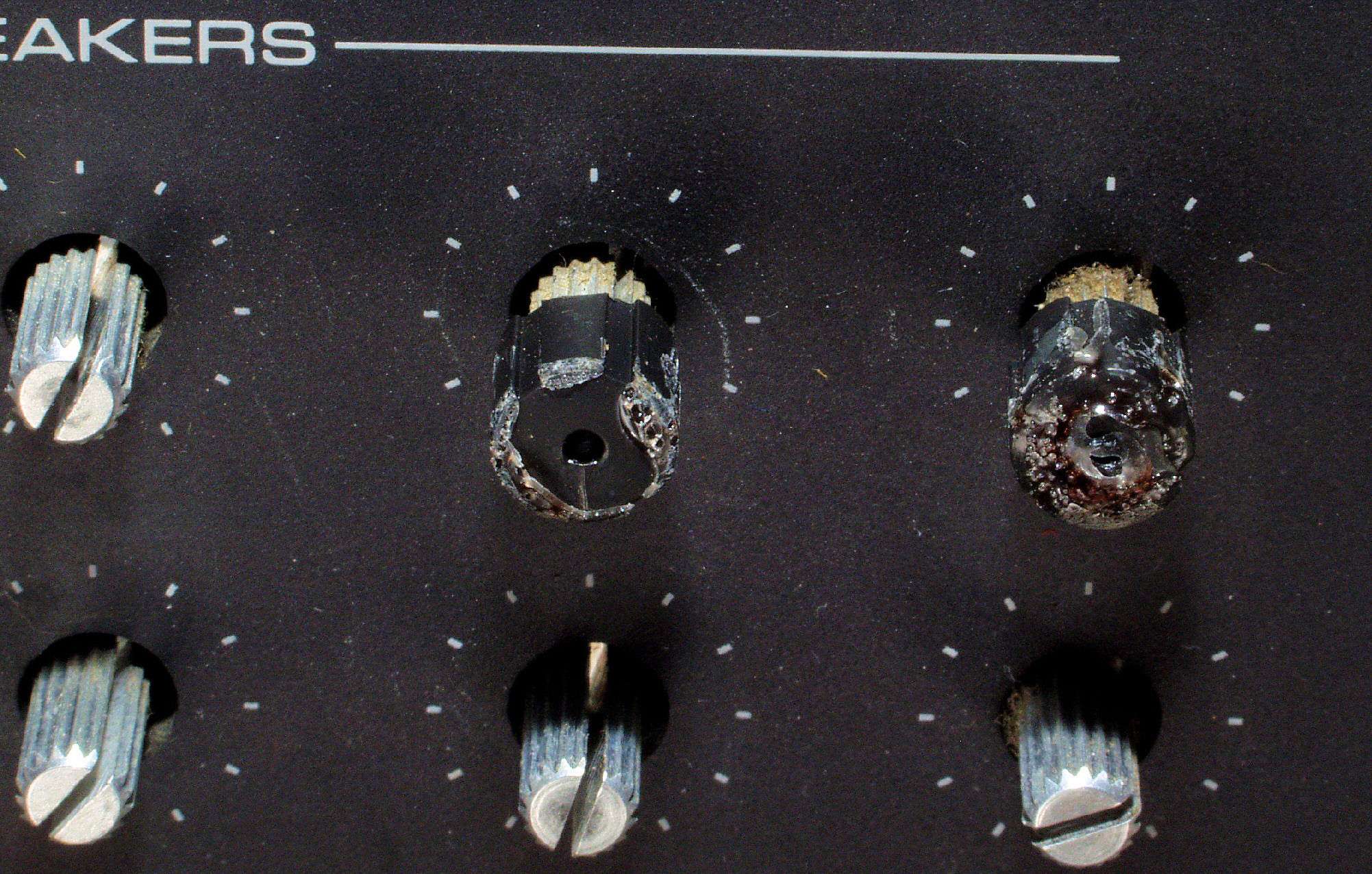 | A413. 点検中、ケースを取り、前から見る。 ツマミの接着材も劣化。 | ||||||||||||||||||||||||||||||||||||||||||||||||||||