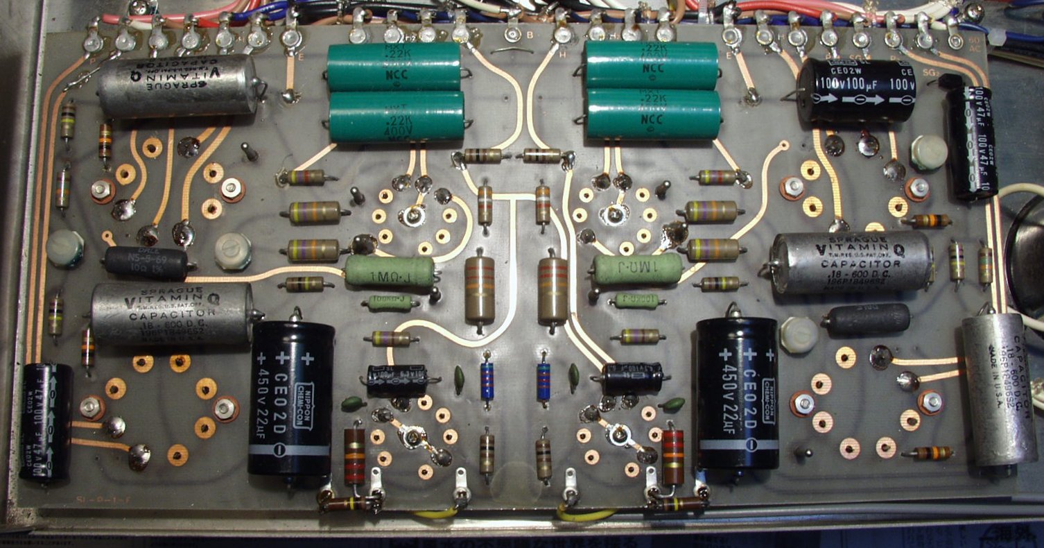 | C1C. 修理後 AMP基板 KT88のソケットは、放熱の為に、十分に半田を盛る |