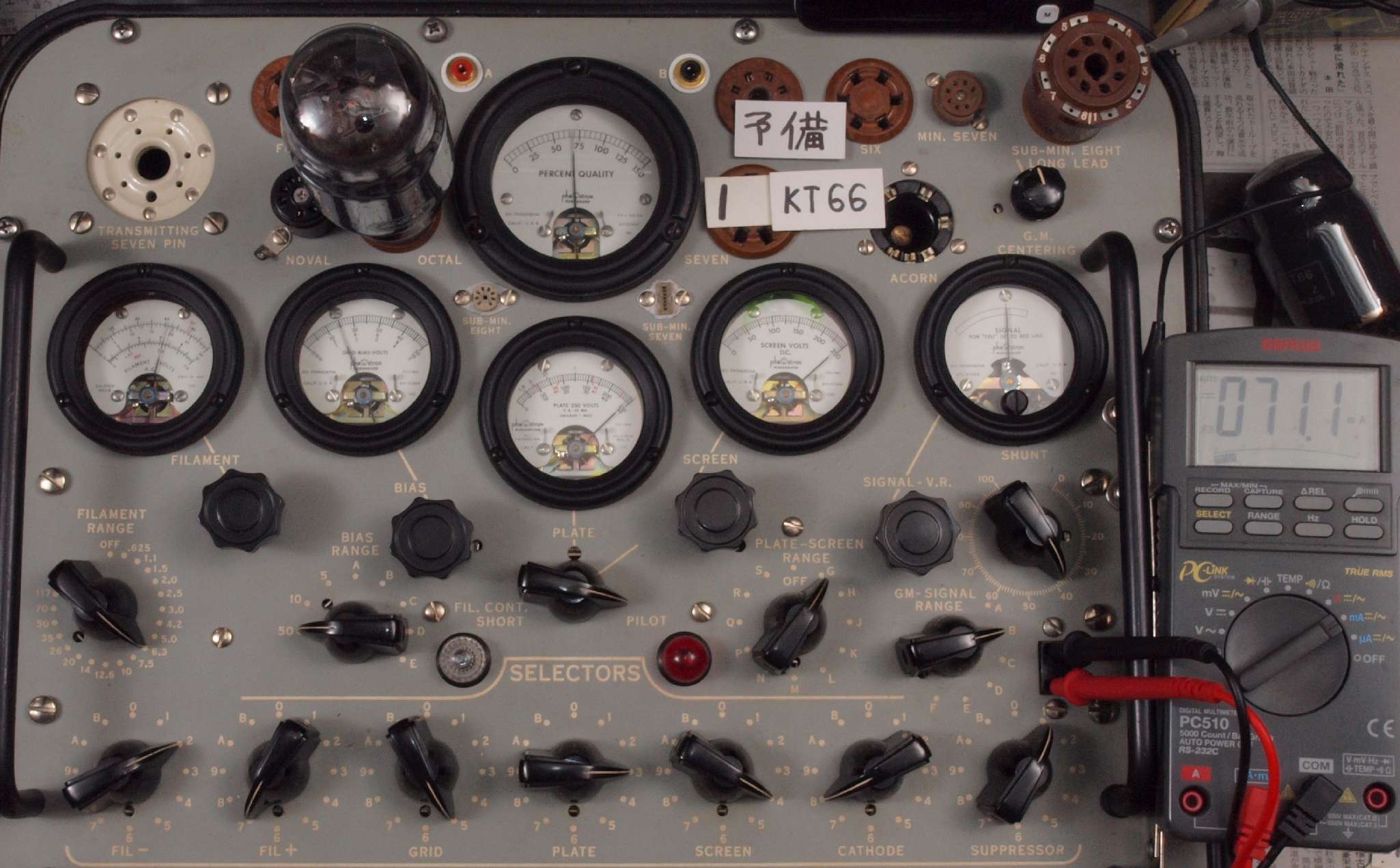 | K1. 1本目「KT66」。 Gm測定=6700μmho、IP=71.1mA。 Cレンジ=15000μmhoレンジでの測定、「Ep=250V、Esg=250V、Eg1=−15V」 |